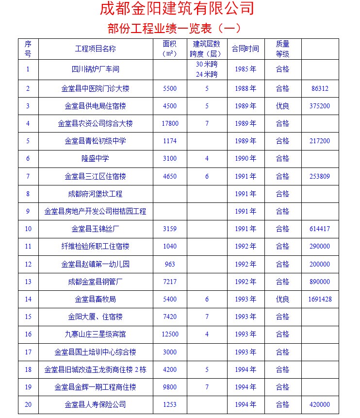 部份工程业绩一览表(一)